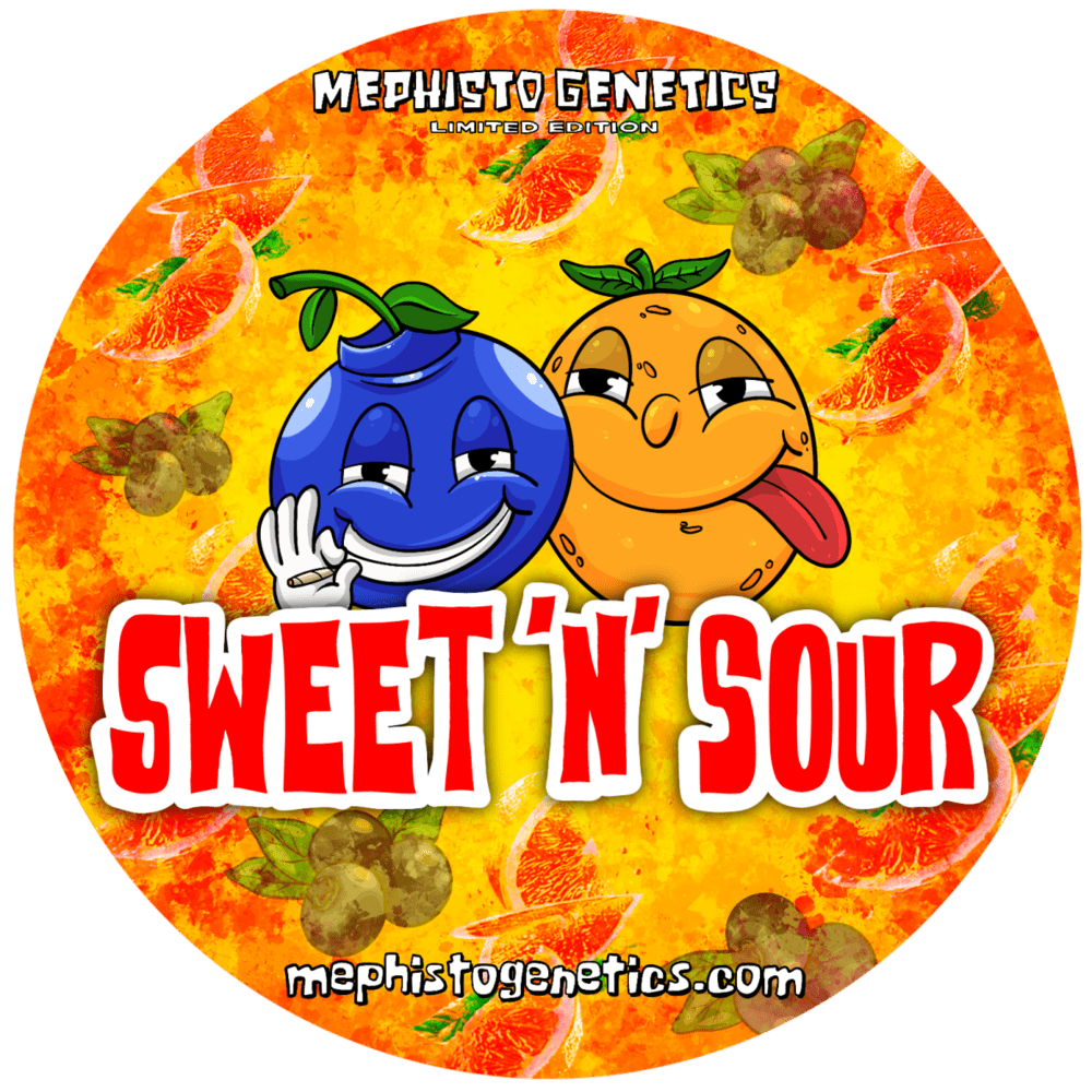 Sweet ‘n’ Sour in typical Mephisto Genetics fashion is a frosty frosty little madam! She grows with nice vigour, displaying a nice blend of indica and sativa traits and has the potential to stack rapidly to produce an array of long colas. Alternatively, she can be heavily trained to produce a flat blanket of sparkling buds. Sweet ‘n’ Sour starts producing frost early on, and her aromas will take you on a journey throughout the grow. Ranging from floral, to sweet, progressing to more outright fruity guavas with a pinch of sourness. The bud-to-leaf ratio of Sweet ‘n’ Sour is frankly exceptional, so whilst big yields are possible, don’t be worried about a stint in trim jail, it’ll be more akin to a short stay in a white-collar prison with tennis courts and day release.