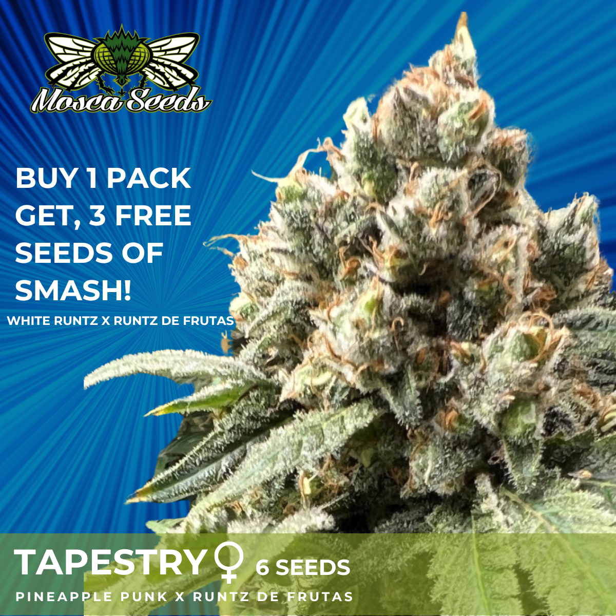 Mosca Seeds’ Tapestry is a feminized F1 cross of Tiki Madman’s Pineapple Punk (Cinderella 99 BX x Pineapple Whip) and Runtz de Frutas (Bubble Gum Runtz x Runtz)!