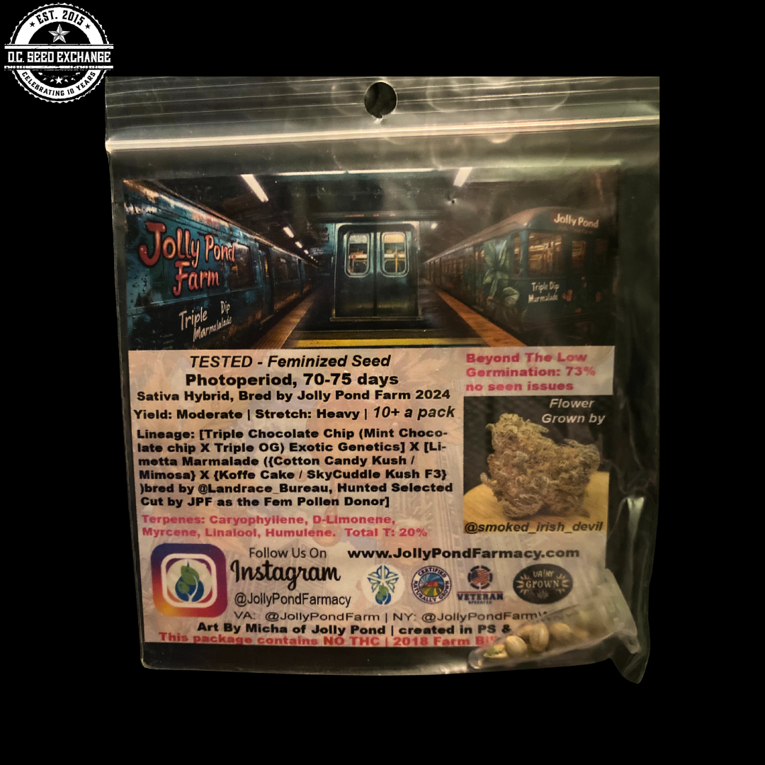 Triple Dip Marmalade is a standout Sativa-dominant hybrid meticulously bred by Jolly Pond Farms in 2024. This feminized cross brings together the dessert-like richness of Triple Chocolate Chip (Mint Chocolate Chip x Triple OG by Exotic Genetix) with the complex, zesty profile of Limetta Marmalade (a unique Landrace Bureau lineage selected by JPF).