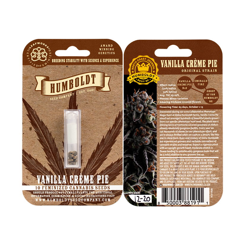 New for 2021, Year of the Exotics! Vanilla Creme Pie was discovered during HSCo’s 2019 Collaborative Phenotype Mega-Hunt at Aloha Humboldt Farms, Vanilla Créme Pie stood out amongst hundreds of beautiful plants grown from their specific phenotype hunt seed. Every year HSCo cut thousands of clones for our pheno-type efforts, and we’re always thrilled when we capture a beauty like this one in clone form.