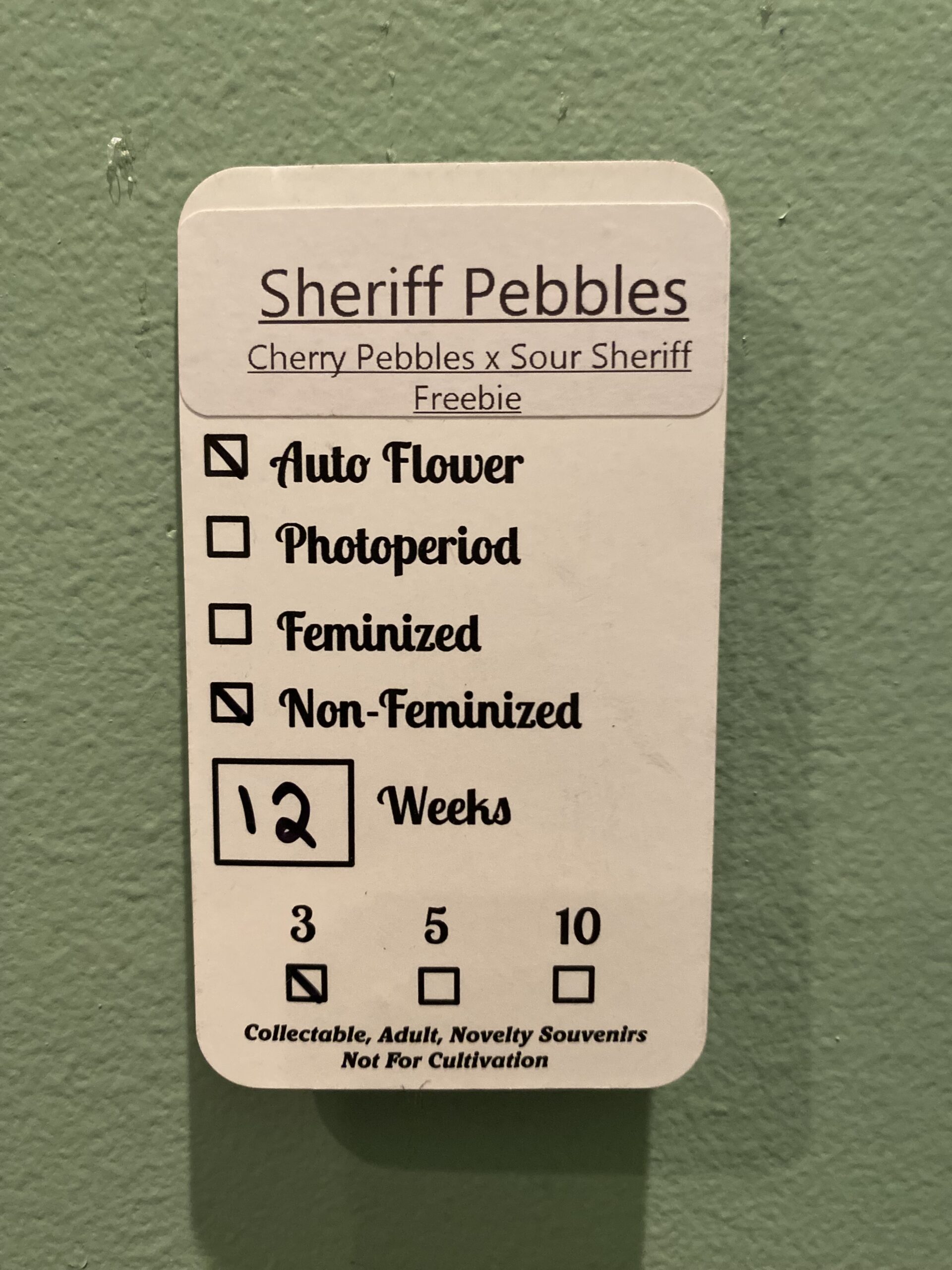 nYou are bidding on one pack of Wicked Pissah’s rare Sheriff Pebbles Auto F1 (Cherry Pebbles x Sour Sheriff) 3 Feminized Autoflower Seeds!